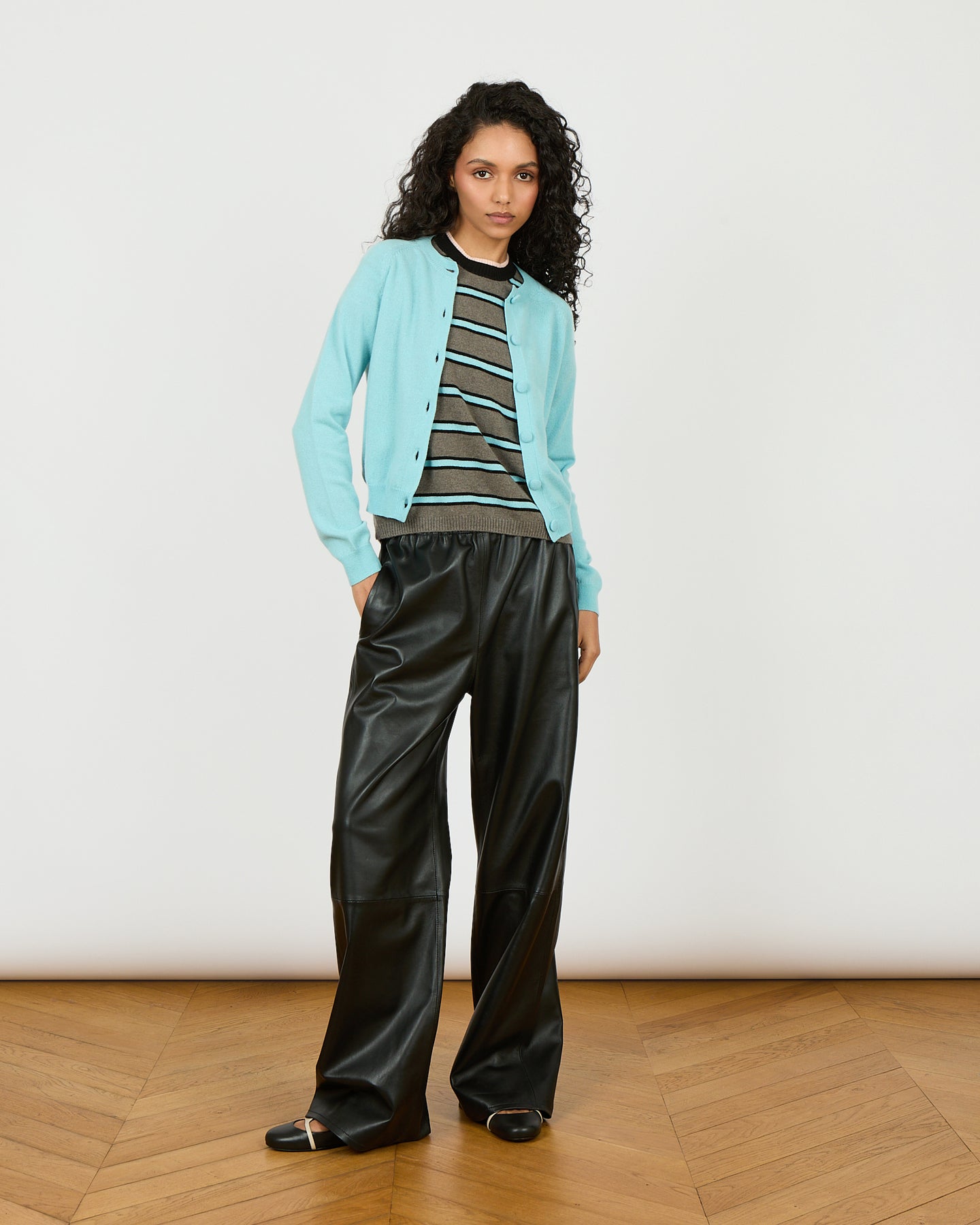 The Mila cardigan falls at the waist and can be worn open or closed.