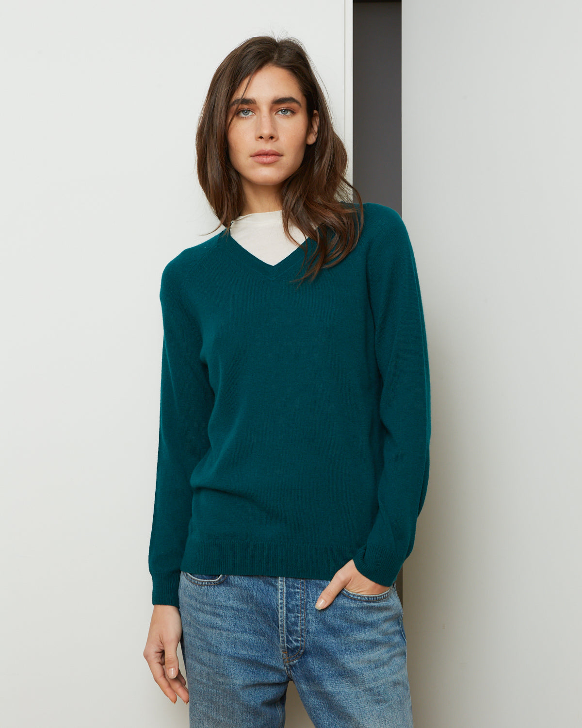 The Catherine is a V-neck sweater, slightly oversized, very comfortable and very chic.