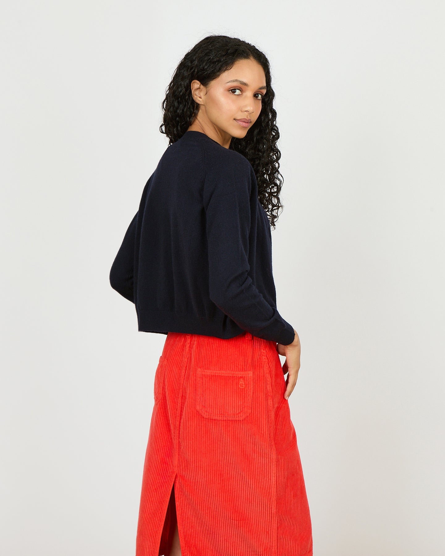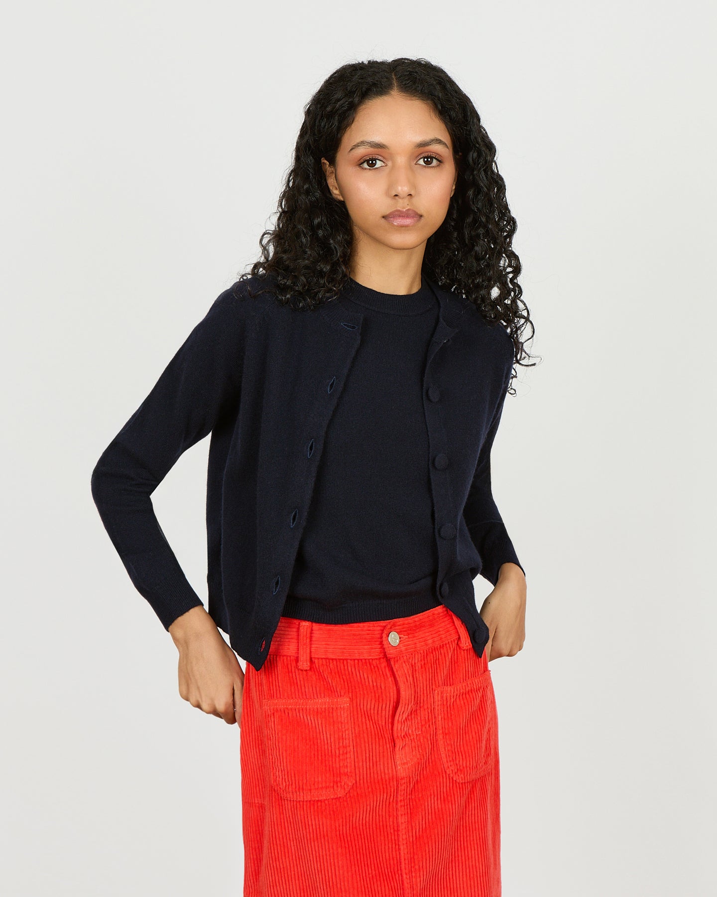 Le cardigan Mila tombe à la taille et peut se porter aussi bien ouvert que fermé.
