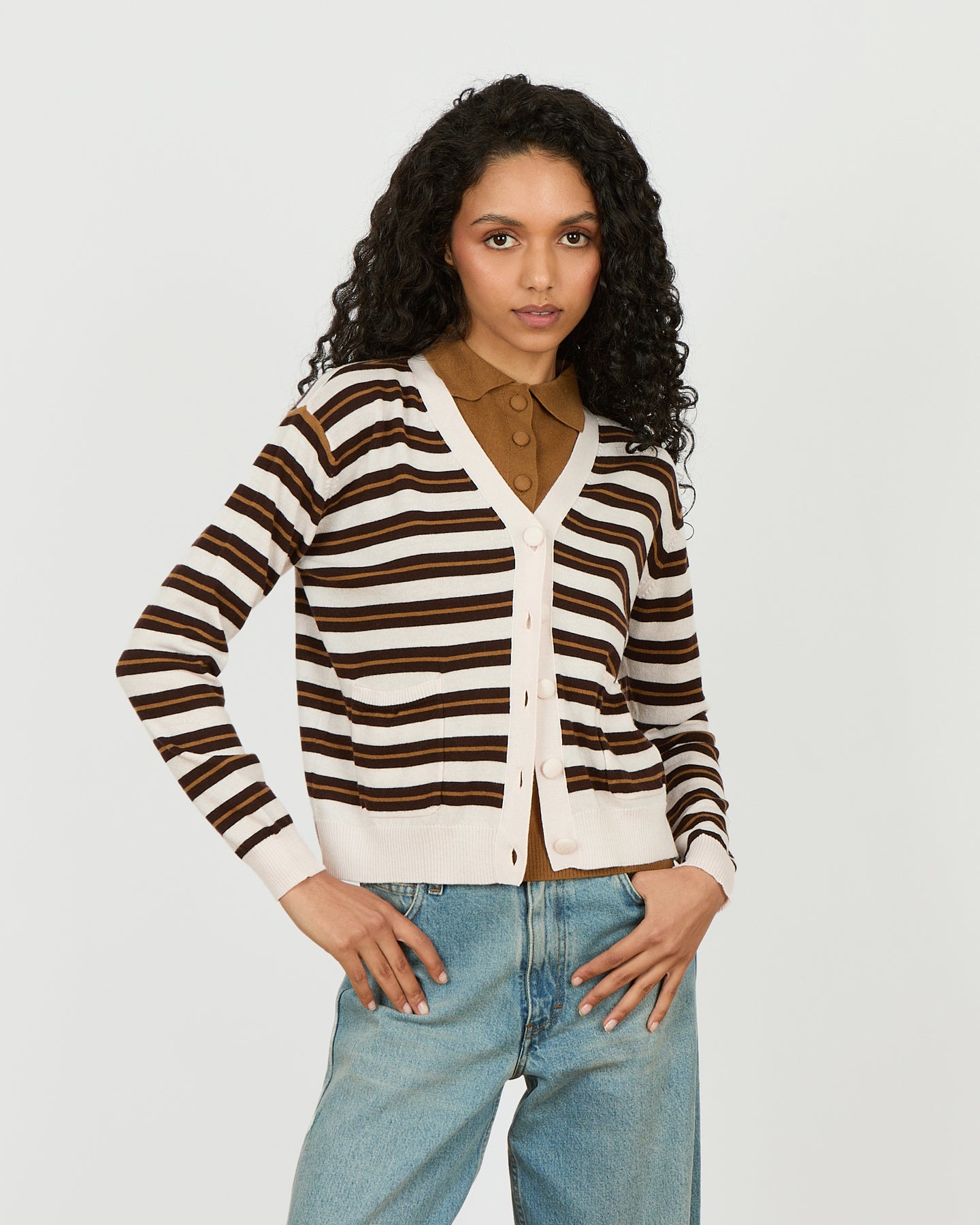 Le cardigan Louise est droit et tombe à la taille. À associer au Roxy ou au Darius pour créer un twin-set.