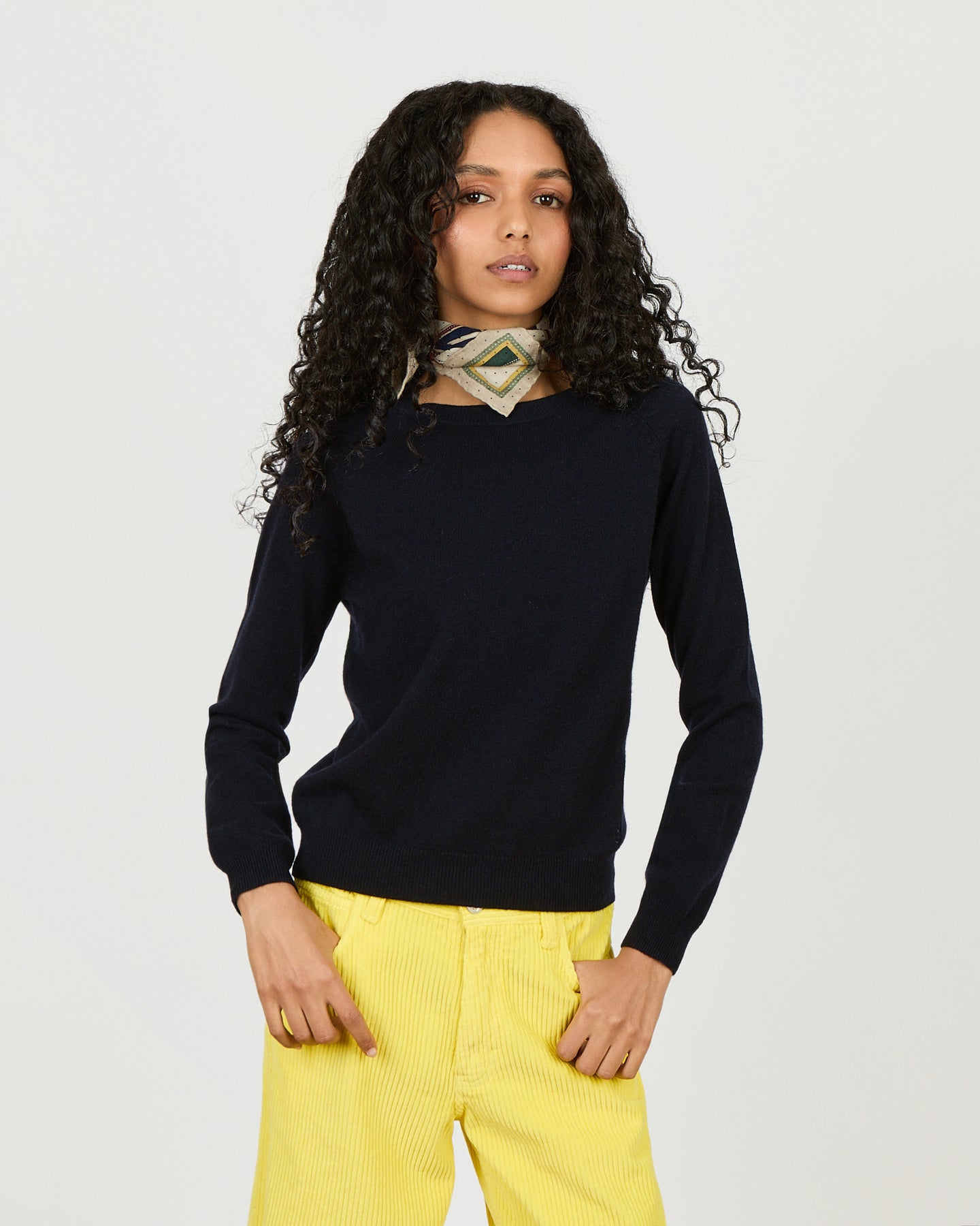 Le Mila est notre pull iconique, il tombe sur les hanches et souligne la taille. Les manches raglans dessinent les épaules.